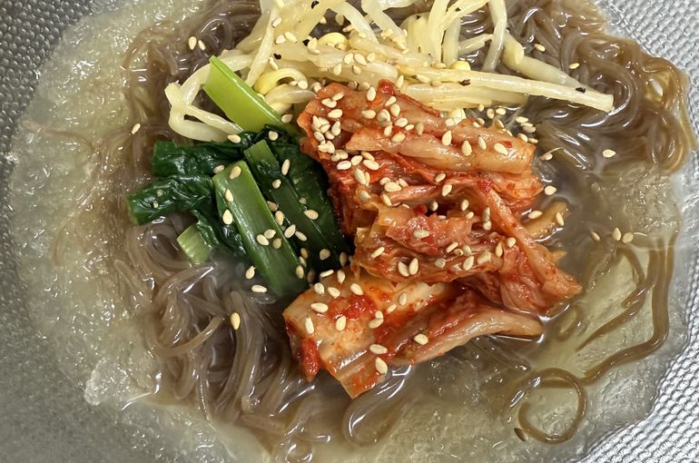 もちもちの食感麺に酸味のあるシャーベット状スープでもやし、アオナ、キムチが乗つてるレーメンになります。