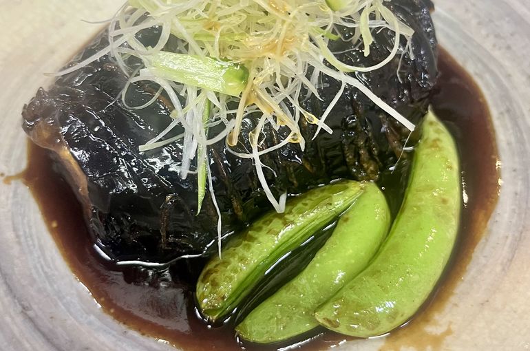 蛇腹に包丁目を入れ、丸ごと一本!ダイナミックに揚げます。それに自家製の黒酢ソースを潜らせれば出来上がり…という至ってシンプルな料理ではございます。